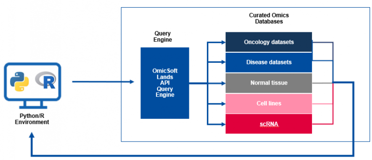 [그림 1] 새로운 OmicSoft Lands API의 개략도. Python 또는 R API 클라이언트는 SQL 쿼리를 OmicSoft Lands API 쿼리 엔진에 제출하며, 이 쿼리 엔진은 Lands 컬렉션의 모든 큐레이션 된 데이터를 검색합니다. 일치하는 데이터세트는 분석을 위해 클라이언트 환경으로 빠르게 반환됩니다.